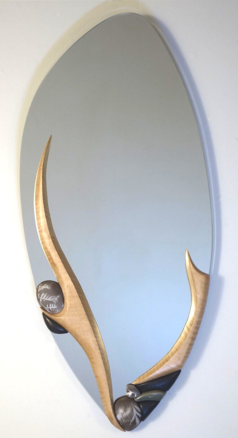 Graceful plumes of sculpted cherry or tiger maple wood and colorful, pit-fired and glazed clay "stones" frame this mirror. Also available with cherry wood and a combination of black, gray and gray-green glazes. Mirror is 1/4" thick. Ready to hang.