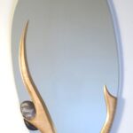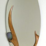 Graceful plumes of sculpted cherry or tiger maple wood and colorful, pit-fired and glazed clay "stones" frame this mirror. Also available with cherry wood and a combination of black, gray and gray-green glazes. Mirror is 1/4" thick. Ready to hang.
